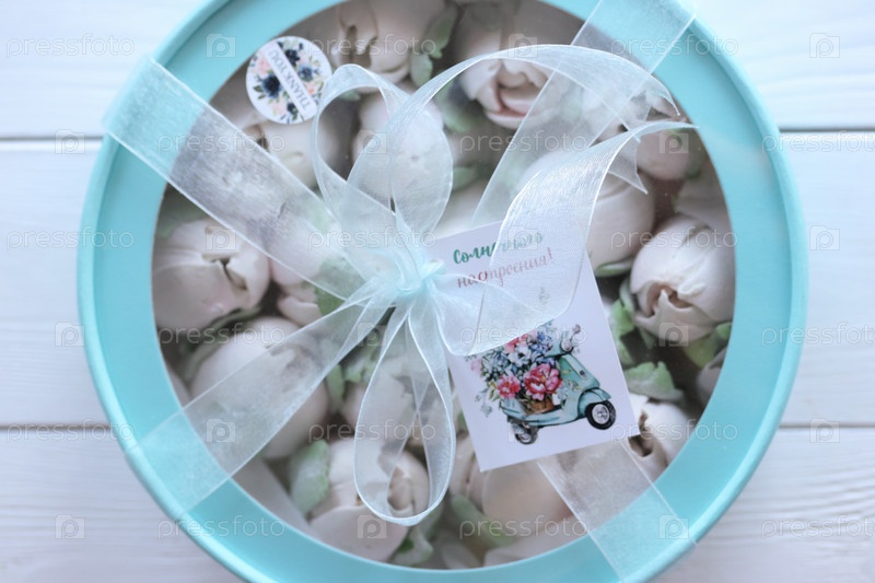 Зефир в коробке. Зефирные тюльпаны. Коробочка бирюзового цвета, перевязана лентой. Он стоит на белых досках. Снято сверху. Крупный план