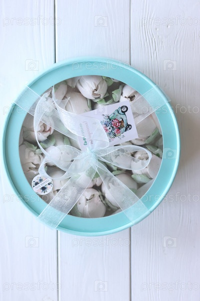 Зефир в коробке. Зефирные тюльпаны. Коробочка бирюзового цвета, перевязана лентой. Он стоит на белых досках. Снято сверху