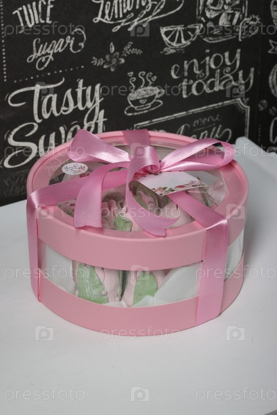Зефир в коробке. Зефирные тюльпаны. Коробочка розовая, перевязана ленточкой. Он стоит на белом столе