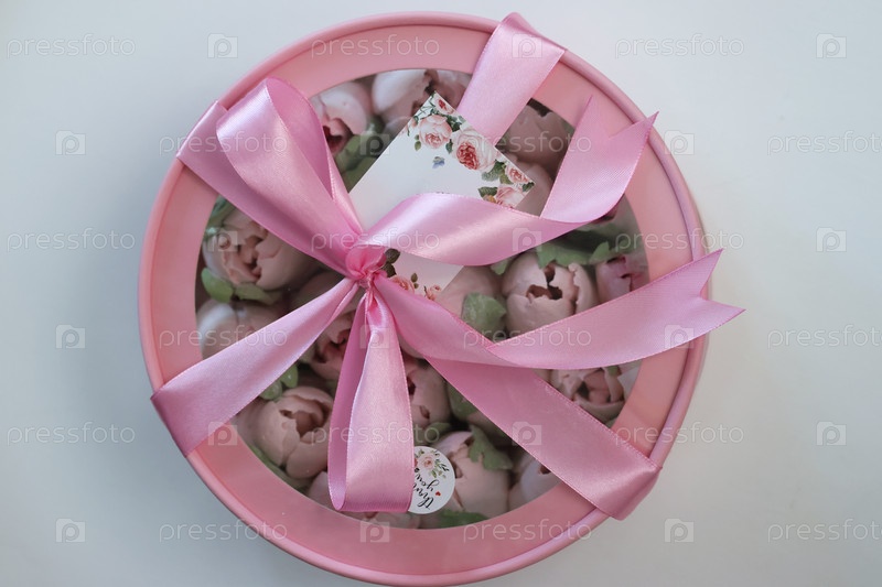Зефир в коробке. Зефирные тюльпаны. Коробочка розовая, перевязана ленточкой. Вид сверху. На белом фоне