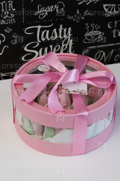 Зефир в коробке. Зефирные тюльпаны. Коробочка розовая, перевязана ленточкой
