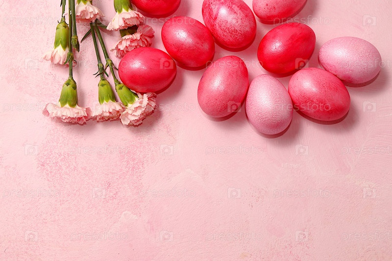 Концепция счастливой Пасхи, весенняя открытка, баннер для экрана с местом для поздравлений, композиция с украшенными розовыми пасхальными яйцами и гвоздиками, шаблон для дизайна. избирательный фокус
