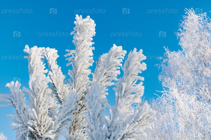 Сосновая ветка покрыта инеем после снегопада на фоне голубого неба