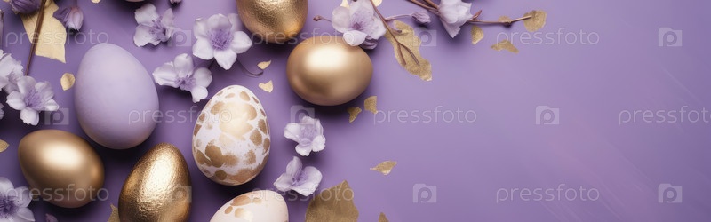 Весенний фон с золотыми фиолетовыми, сиреневыми пасхальными яйцами и свежими цветами. пространство для копирования, место для текста