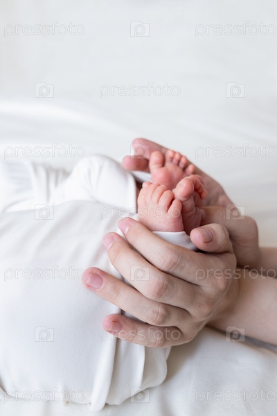 Руки мамы и папы держат маленькие ножки двух новорожденных близнецов