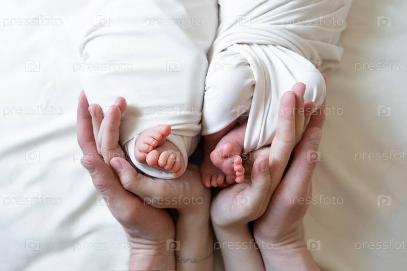 Руки мамы и папы держат маленькие ножки двух новорожденных близнецов