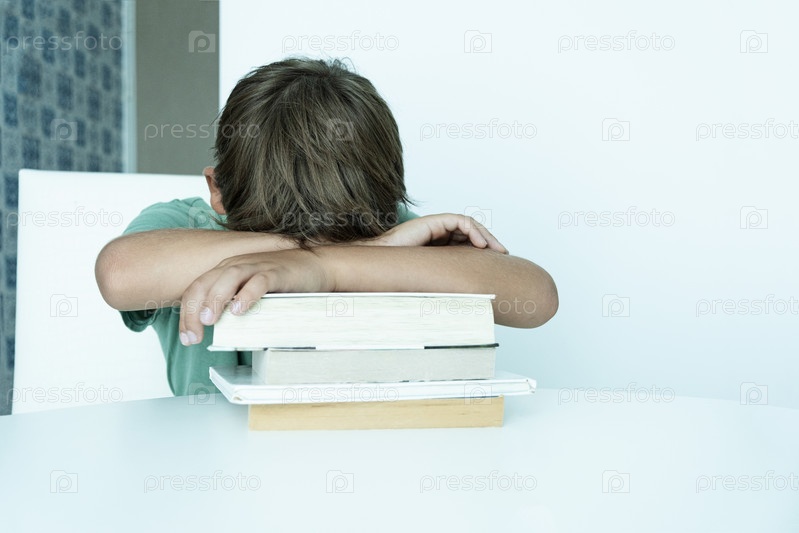 Грустный мальчик с книгой делает домашнее задание. Обратно в школу. Несчастный школьник с учебниками. Дистанционное обучение