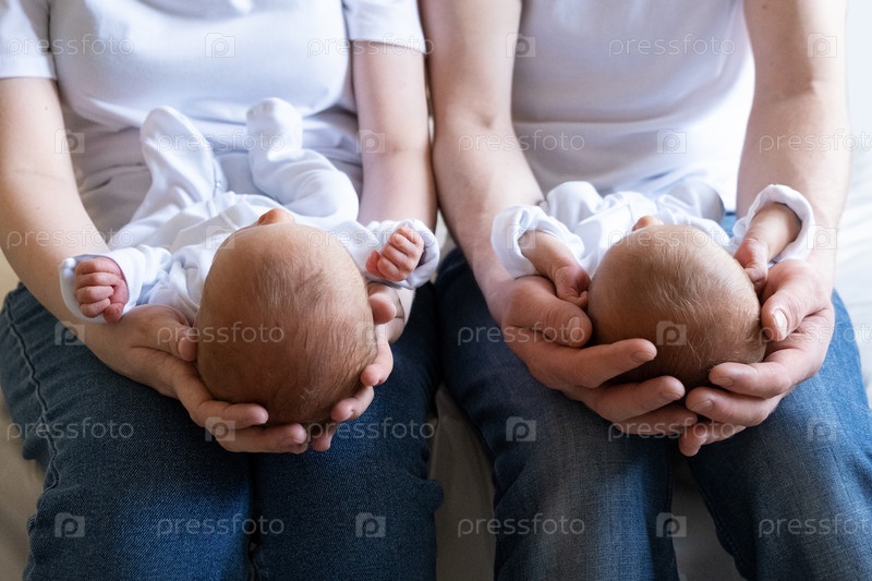 Новорожденные однояйцевые близнецы на кровати, на руках родителей. Образ жизни, эмоции детей. Младенцы с копией пространства
