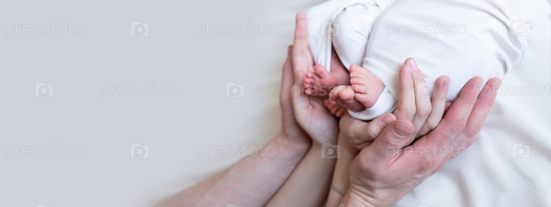 Баннер. Руки мамы и папы держат маленькие ножки двух новорожденных близнецов