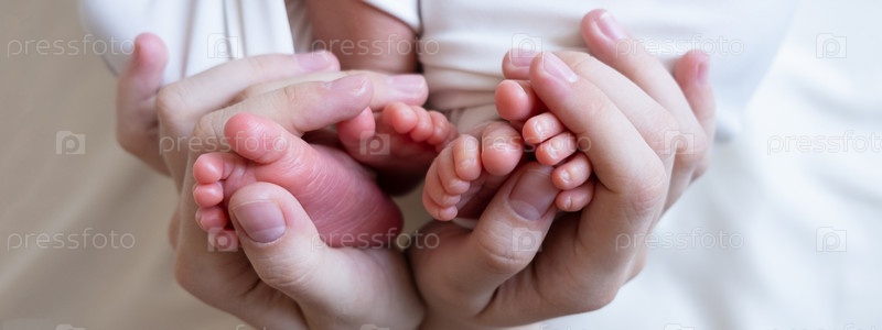 Баннер. Руки мамы держат маленькие ножки двух новорожденных близнецов