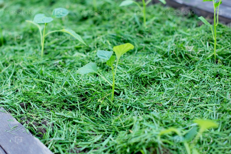 Мульчирование верхнего слоя почвы на овощной грядке скошенной травой с газона. производство биогумусных органических удобрений. Эрозия земли