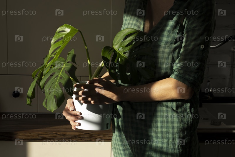 Женщина держит растение монстра в белом горшке на белой кухне. Концепция минимализма. Листья Monstera deliciosa или тропические листья швейцарского сыра. Дневный свет, резкие тени