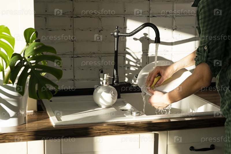 Женские руки моют посуду дома. Плиты под струей воды при солнечном свете. домашняя рутина
