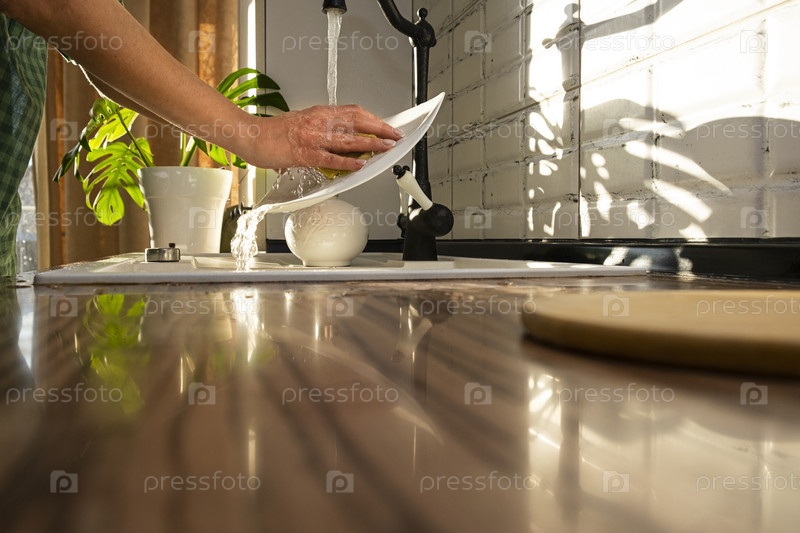 Женские руки моют посуду дома. Плиты под струей воды при солнечном свете. домашняя рутина