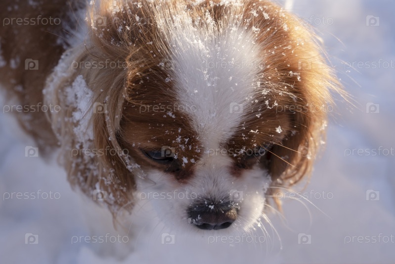 Милая собака, щенок в снегу зимой. снежинки на шерсти собаки, питомец в сугробе