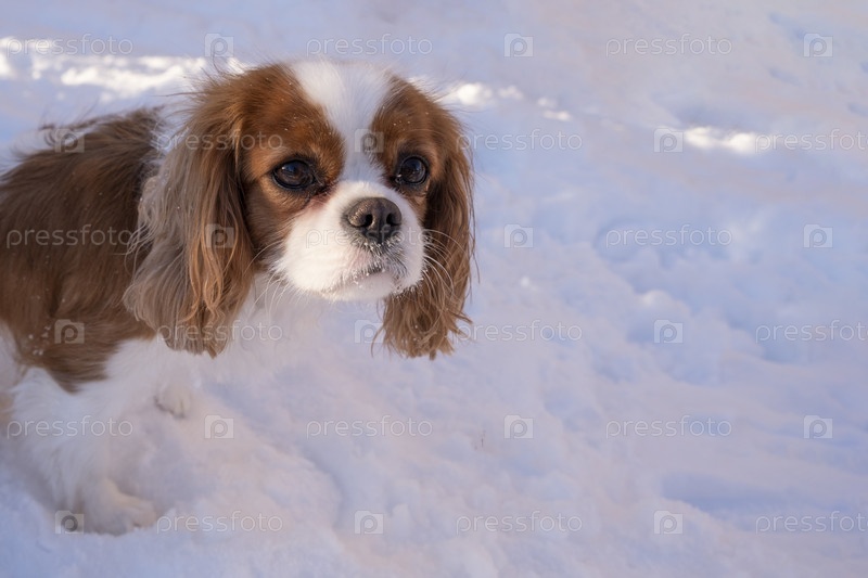 Милая собака, щенок в снегу зимой. Кавалер-кинг-чарльз-спаниель. домашнее животное в сугробе