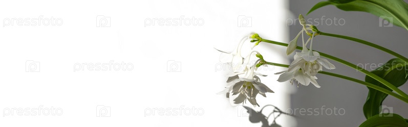 Зеленые листья Евхариса для оформления композиции. Завод в горшке с тропическими листьями на сером фоне. Дневной свет, резкие тени