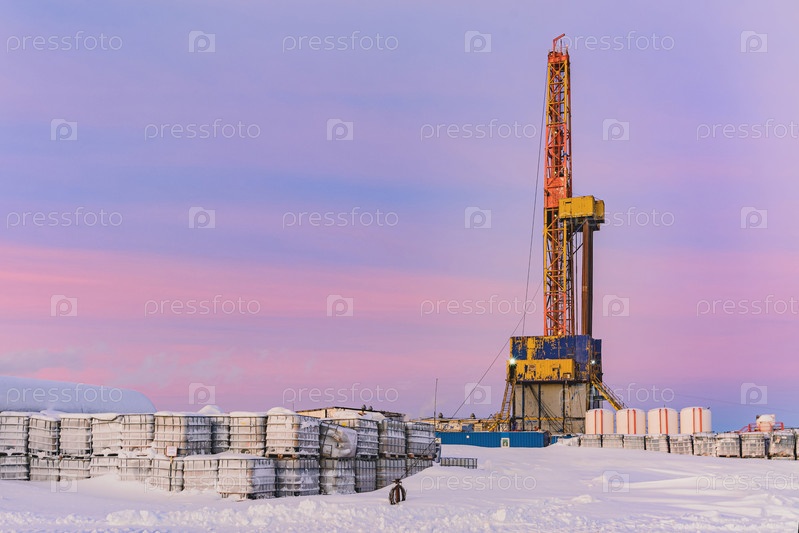 Бурение нефтяных и газовых скважин на месторождении Мадачаг в Баренцевом море. Буровая установка и технологическое оборудование в заснеженной арктической тундре. Розовый цвет неба в зимний полярный день