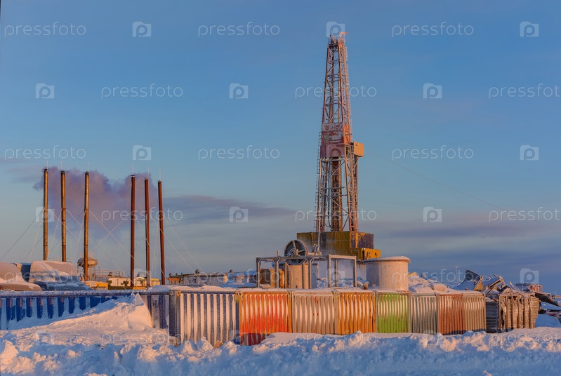 Буровая установка и оборудование для бурения нефтяных и газовых скважин в Арктике. Мадачагское нефтегазовое месторождение в Баренцевом море. Зимний полярный день. Голубое небо, снежная и морозная погода