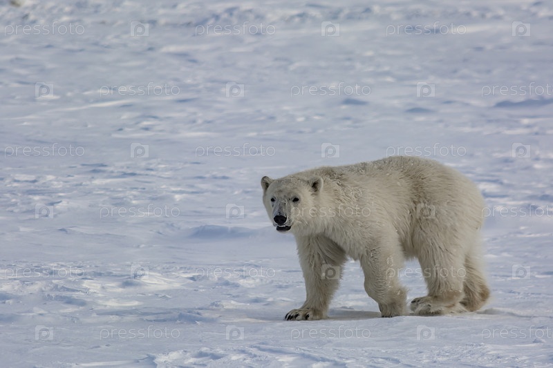 Белый медведь гуляет среди арктических льдов. Он нюхает воздух и отправляется на поиски добычи. Зимний день на полуострове Ямал
