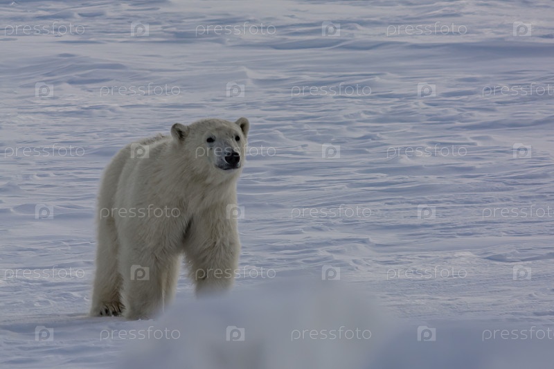 Белый медведь гуляет среди арктических льдов. Он нюхает воздух и отправляется на поиски добычи. Зимний день на полуострове Ямал