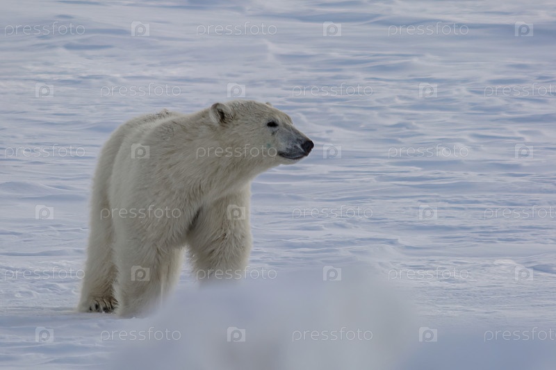 Белый медведь гуляет среди арктических льдов. Он нюхает воздух и отправляется на поиски добычи. Зимний день на полуострове Ямал