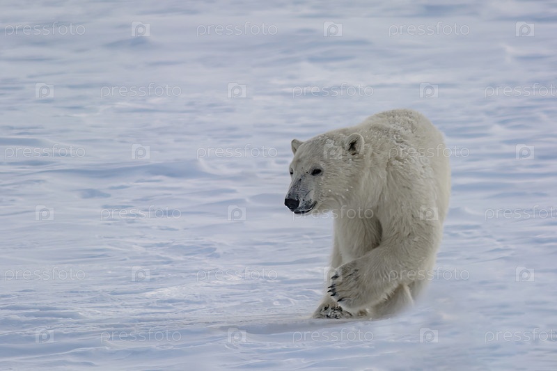 Белый медведь гуляет среди арктических льдов. Он нюхает воздух и отправляется на поиски добычи. Зимний день на полуострове Ямал