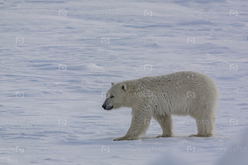 Белый медведь гуляет среди арктических льдов. Он нюхает воздух и отправляется на поиски добычи. Зимний день на полуострове Ямал
