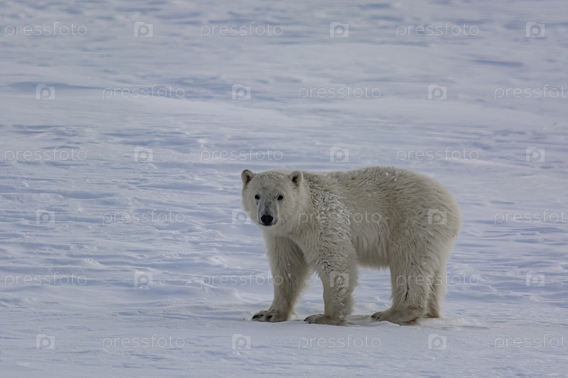 Белый медведь гуляет среди арктических льдов. Он нюхает воздух и отправляется на поиски добычи. Зимний день на полуострове Ямал