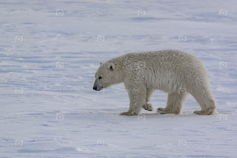 Белый медведь гуляет среди арктических льдов. Он нюхает воздух и отправляется на поиски добычи. Зимний день на полуострове Ямал