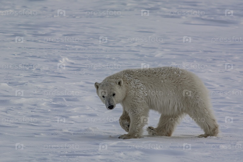 Белый медведь гуляет среди арктических льдов. Он нюхает воздух и отправляется на поиски добычи. Зимний день на полуострове Ямал