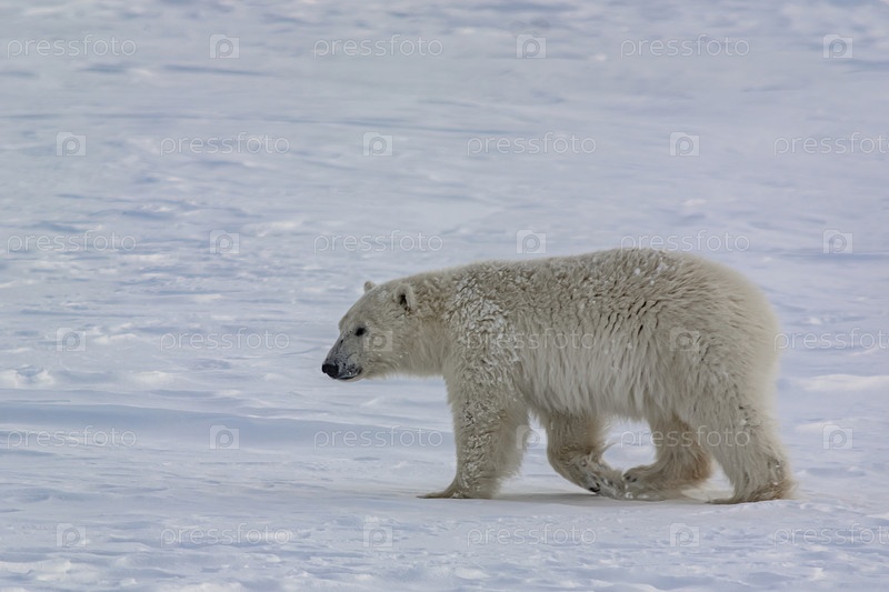 Белый медведь гуляет среди арктических льдов. Он нюхает воздух и отправляется на поиски добычи. Зимний день на полуострове Ямал