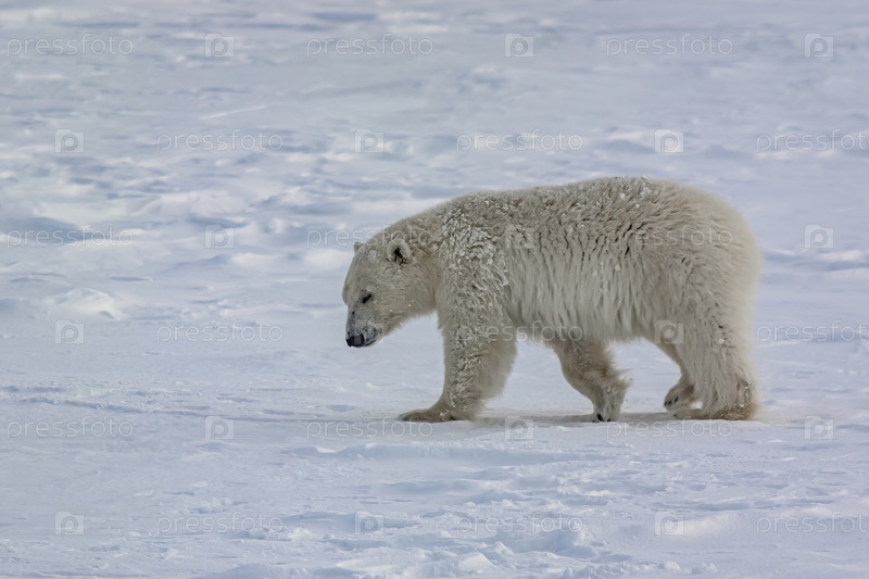 Белый медведь гуляет среди арктических льдов. Он нюхает воздух и отправляется на поиски добычи. Зимний день на полуострове Ямал