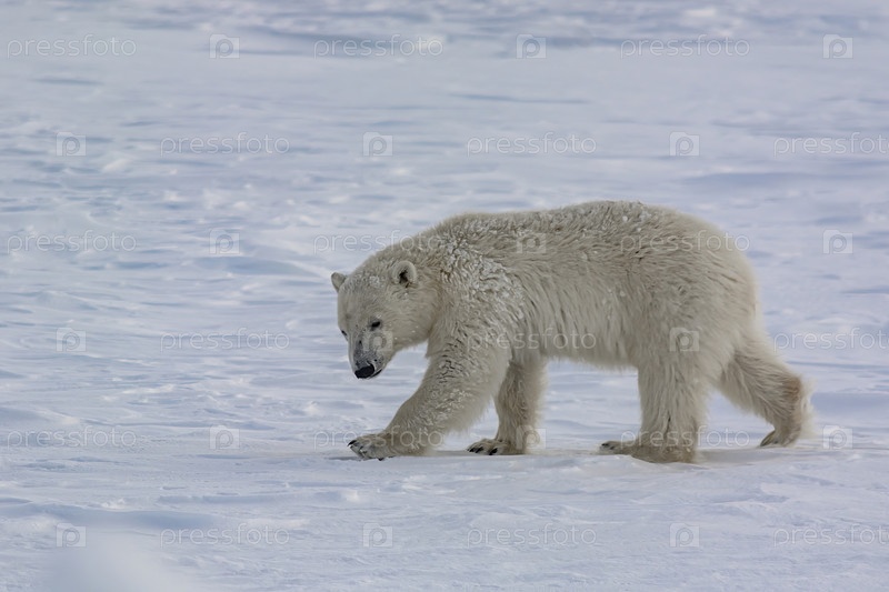 Белый медведь гуляет среди арктических льдов. Он нюхает воздух и отправляется на поиски добычи. Зимний день на полуострове Ямал