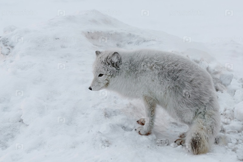 Жизнь песцов в северной зимней тундре. Белые и пушистые песцы охотятся и играют в снегу. Дикая фауна Заполярья на арктических островах