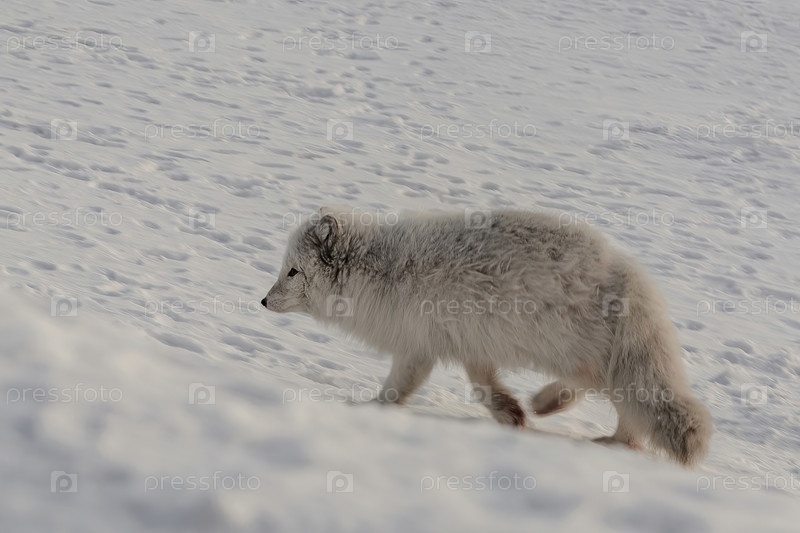 Жизнь песцов в северной зимней тундре. Белые и пушистые песцы охотятся и играют в снегу. Дикая фауна Заполярья на арктических островах