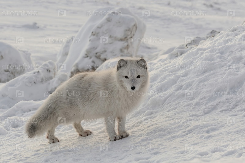 Жизнь песцов в северной зимней тундре. Белые и пушистые песцы охотятся и играют в снегу. Дикая фауна Заполярья на арктических островах
