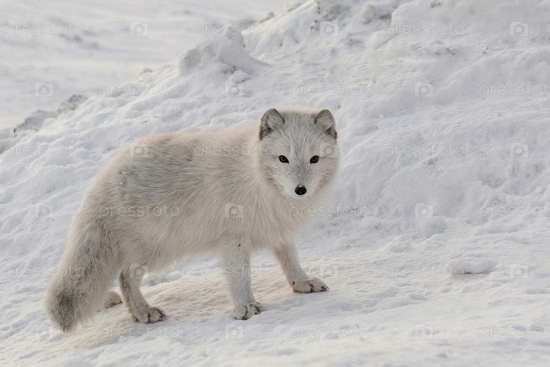Жизнь песцов в северной зимней тундре. Белые и пушистые песцы охотятся и играют в снегу. Дикая фауна Заполярья на арктических островах