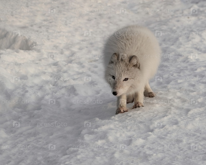 Жизнь песцов в северной зимней тундре. Белые и пушистые песцы охотятся и играют в снегу. Дикая фауна Заполярья на арктических островах