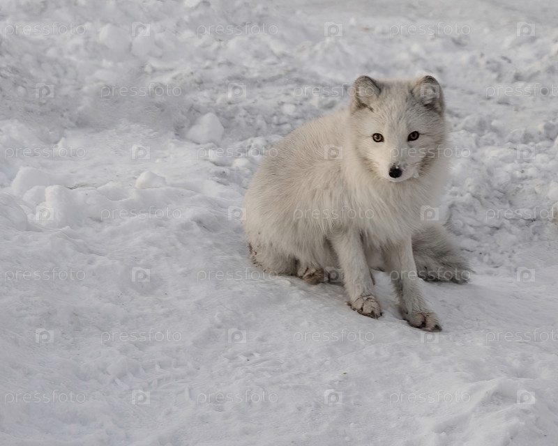 Жизнь песцов в северной зимней тундре. Белые и пушистые песцы охотятся и играют в снегу. Дикая фауна Заполярья на арктических островах