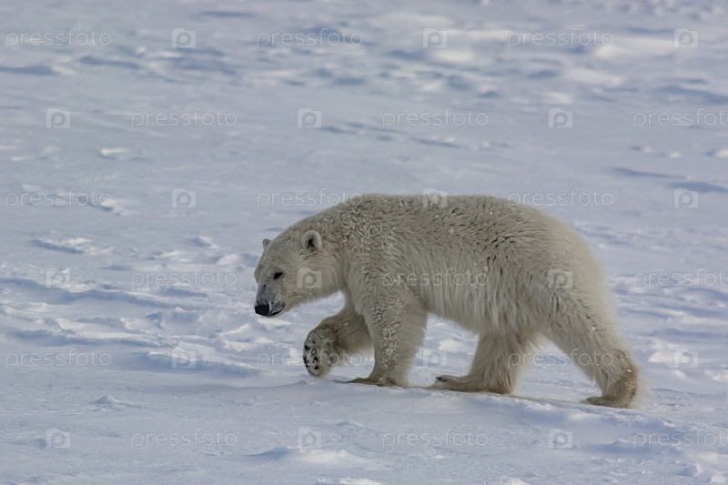 Белый медведь гуляет среди арктических льдов. Он нюхает воздух и отправляется на поиски добычи. Зимний день на полуострове Ямал