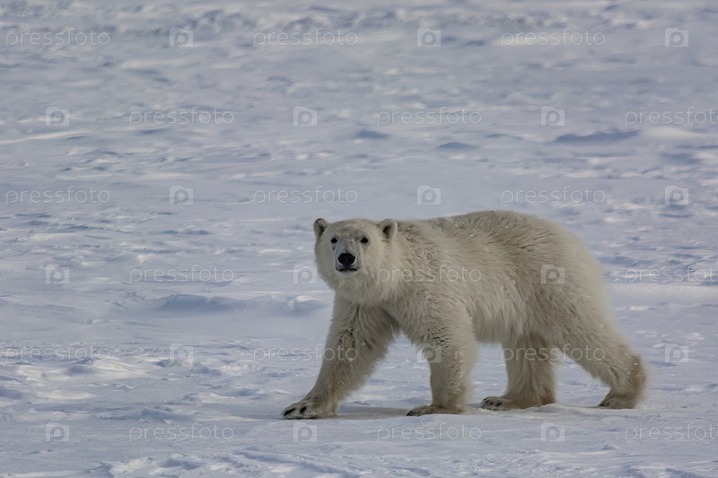 Белый медведь гуляет среди арктических льдов. Он нюхает воздух и отправляется на поиски добычи. Зимний день на полуострове Ямал