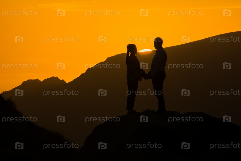 Закат в горах. влюбленная молодая пара парень и девушка стоят на вершине горы во время заката, силуэты людей