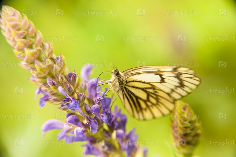 Бабочка с белыми крыльями собирает пыльцу с цветка