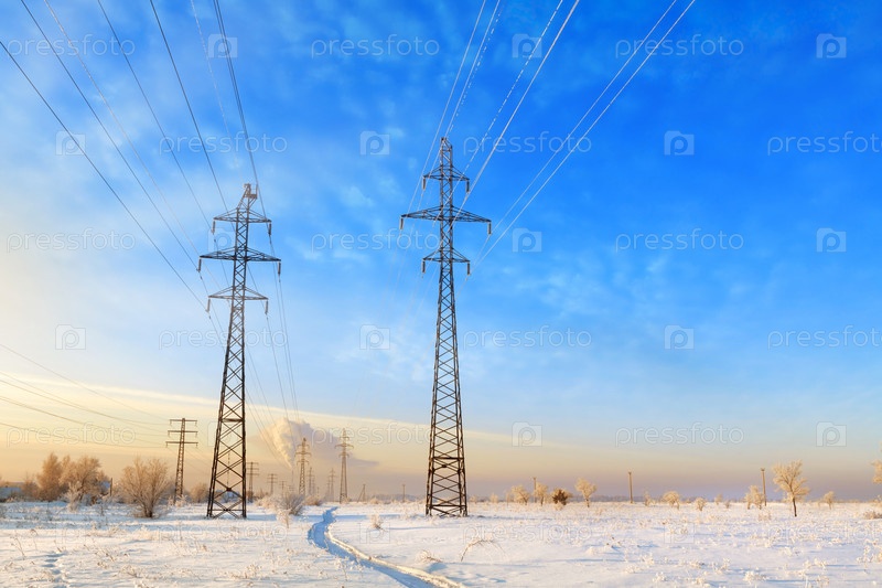 Линии электропередач высокого напряжения на закате. Зимний пейзаж