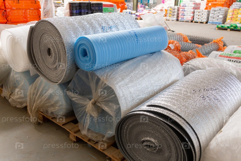 Различные изоляционные материалы в рулонах продаются на складе магазина. Большие рулоны полиэтилена с термоалюминиевой фольгой для обшивки домов и построек, чтобы обеспечить тепло при хранении