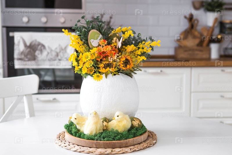 Весенний букет, желтые цыплята в большом яйце и пасхальные яйца с золотым узором на столе. На заднем плане — белая кухня в скандинавском стиле. Пасхальный декор в доме