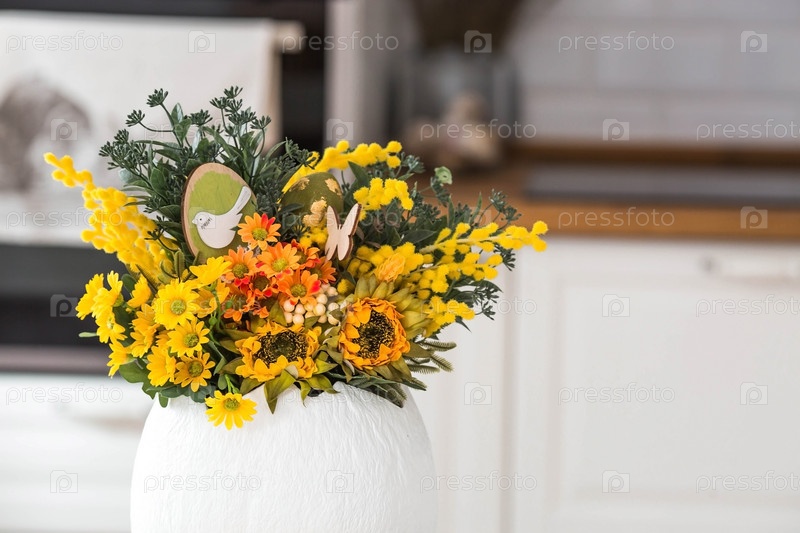 Весенний букет в яйце, пасхальные кролики и яйца с золотым узором на столе. На заднем плане — белая кухня в скандинавском стиле. Красивая поздравительная открытка. Пасхальный декор в доме