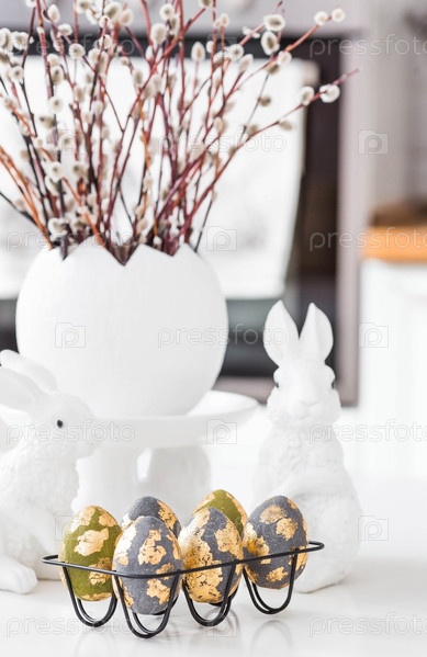 Букет из веточек вербы к православному празднику Вербного воскресенья. Верба в белом яйце, пасхальные кролики и пасхальные яйца в интерьере современной белой кухни