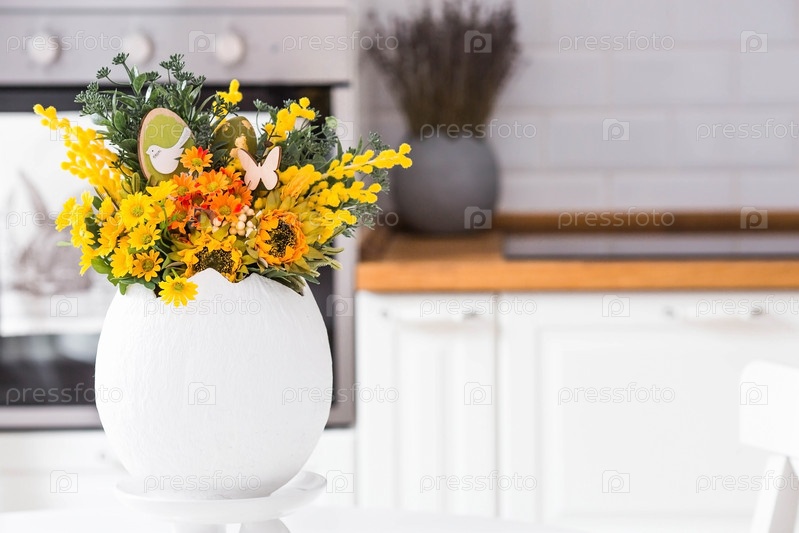 Весенний букет в яйце, пасхальные кролики и яйца с золотым узором на столе. На заднем плане — белая кухня в скандинавском стиле. Красивая поздравительная открытка. Пасхальный декор в доме